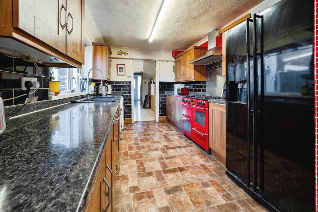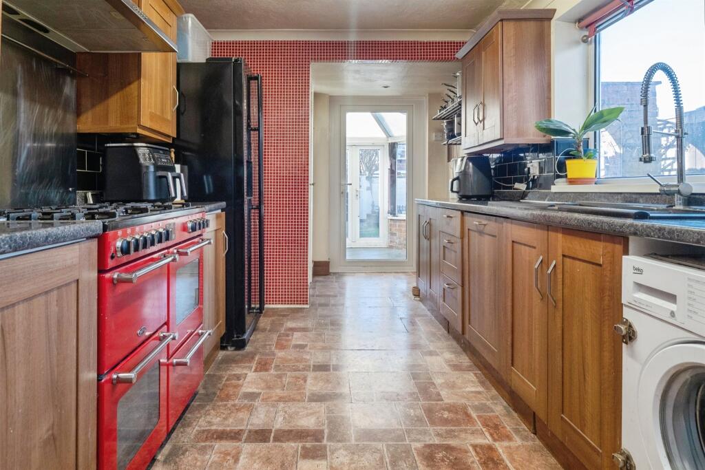 Fitted kitchen with a range of wall and base units, work surfaces, sink and drainer unit, space for a range style cooker, cooker-hood, plumbing for an automatic washing machine, plumbing for a dishwasher, double glazed window to the side and double glazed door leading to the Conservatory.