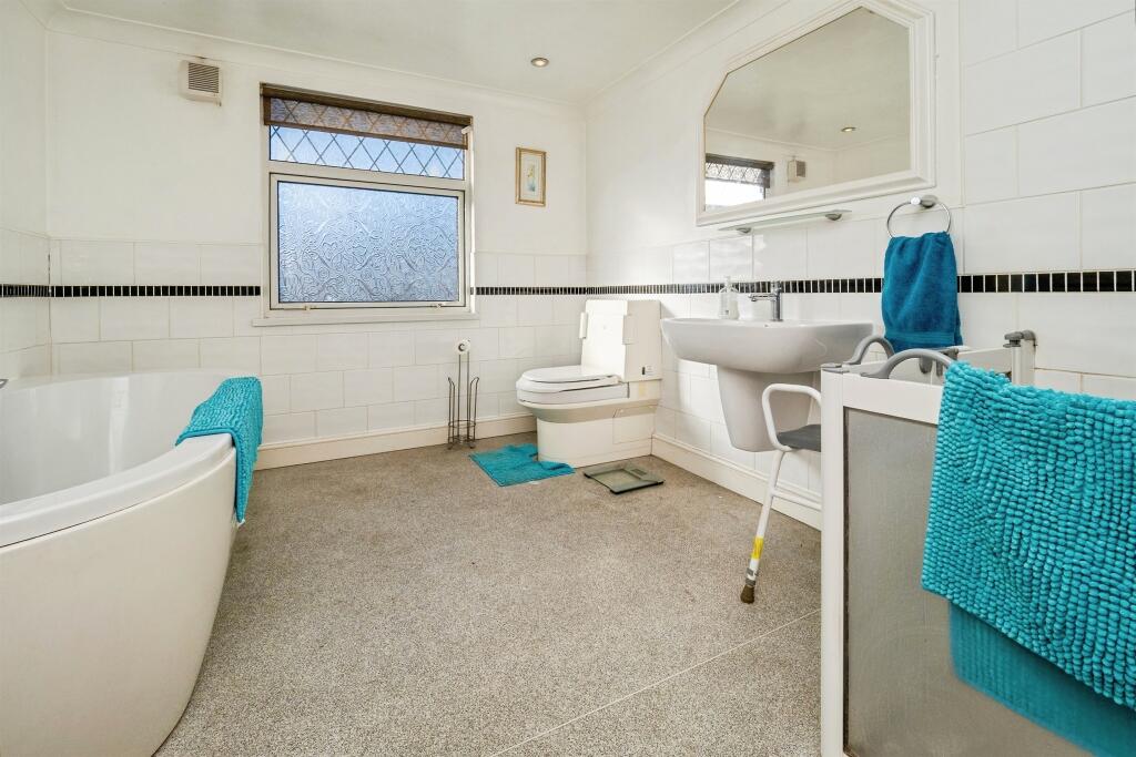 Bathroom with bath, walk in shower, wash hand basin, low level wc, radiator, extractor fan, spot light points, storage cupboard and double glazed window to the rear.