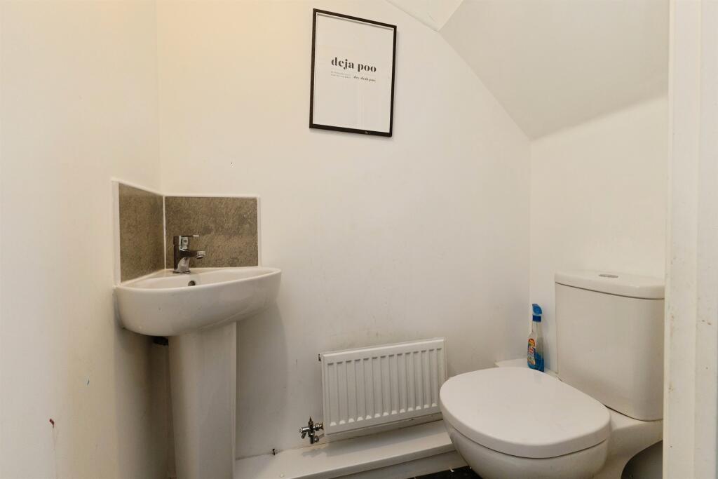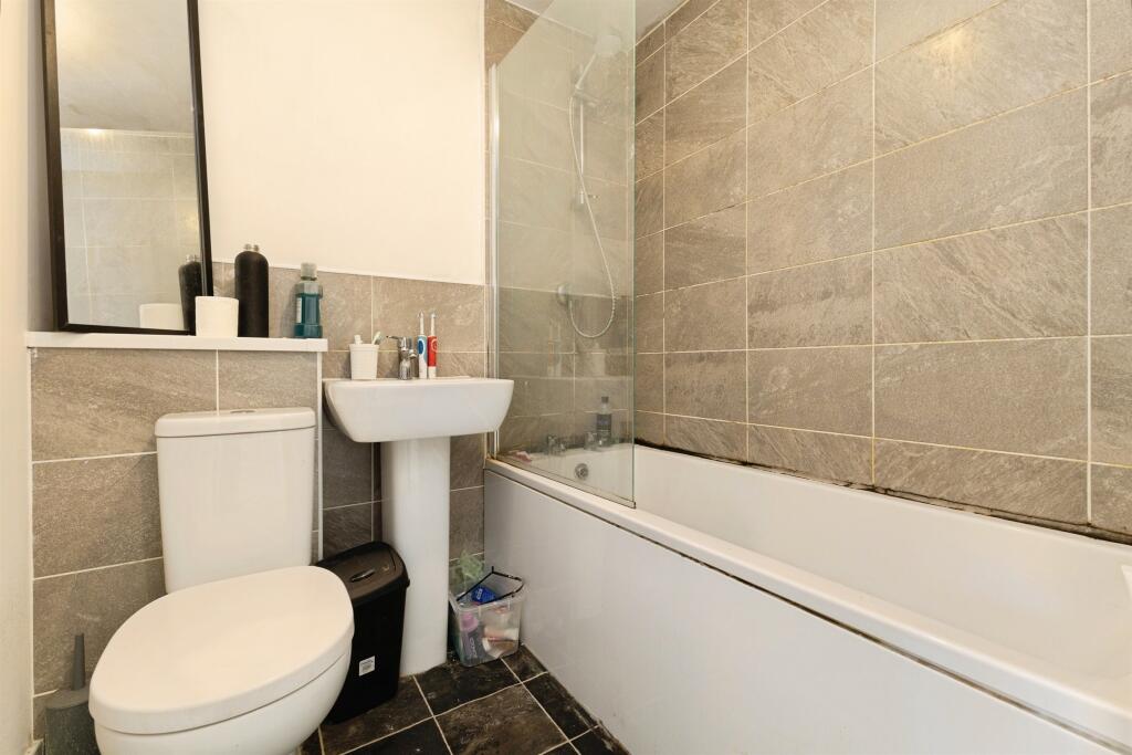 Toilet, wash hand basin with mixer tap, bath, part tiled wall, radiator.